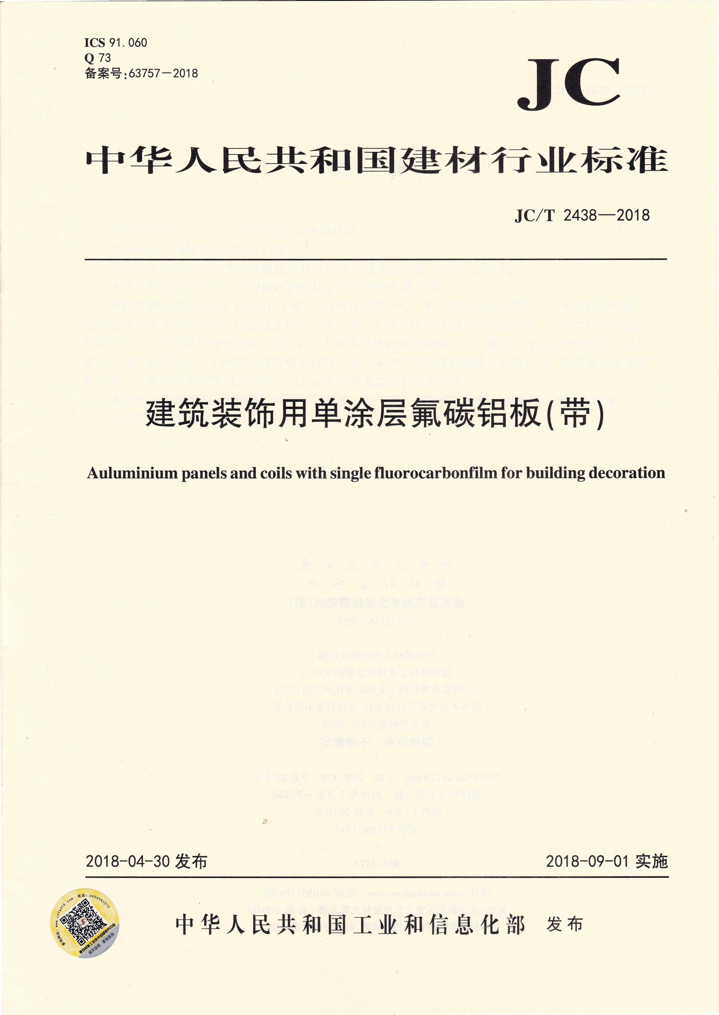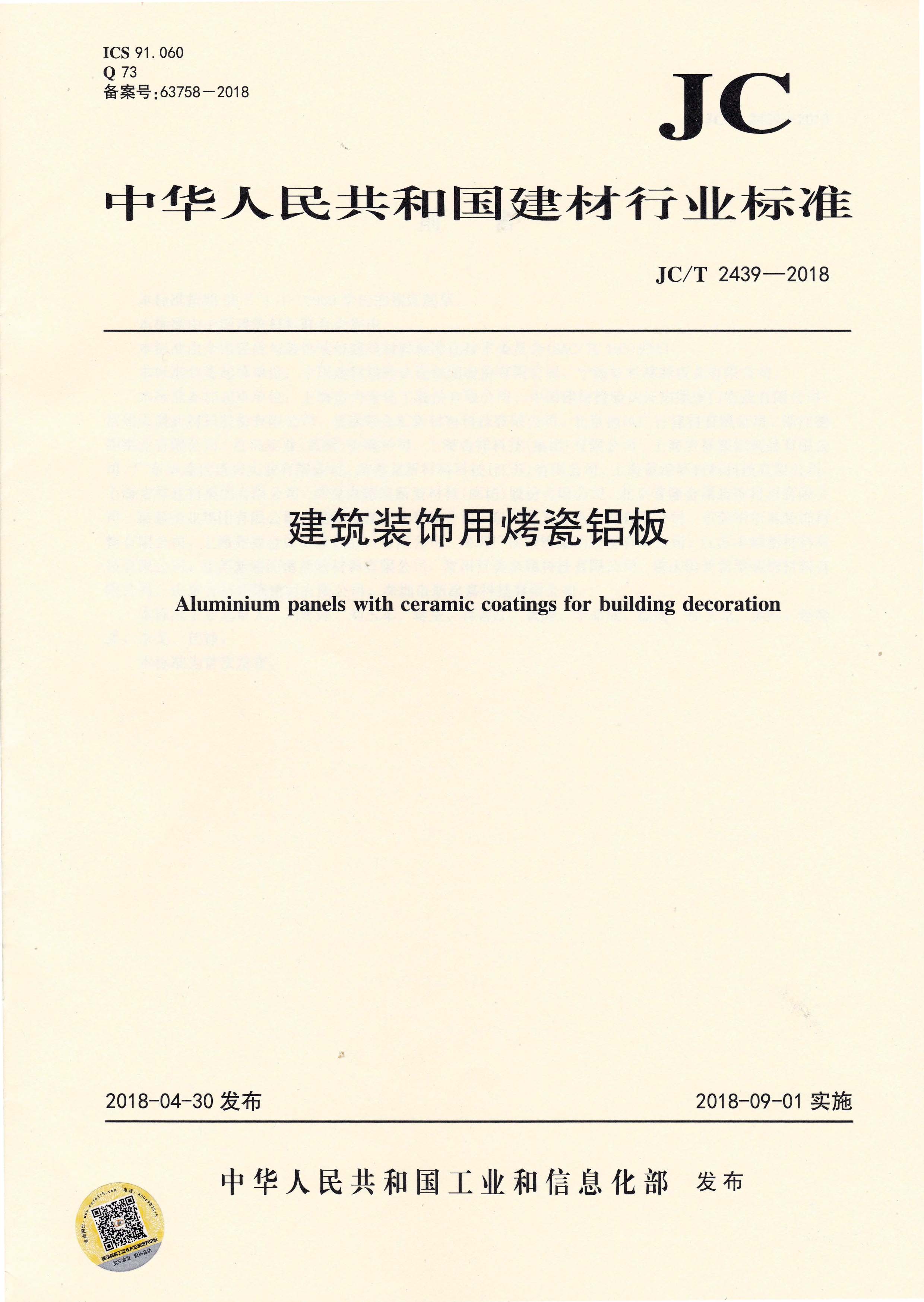 近日,由中國建筑材料聯(lián)合會提出,雅泰實業(yè)集團有限公司參與起草的JC/T 2439-2018《建筑裝飾用烤瓷鋁板》、JC/T 2438-2018《建筑裝飾用單涂層氟碳鋁板(帶)》兩項行業(yè)標(biāo)準(zhǔn)于2018年4月30日首次發(fā)布,2018年9月1日起正式實施。