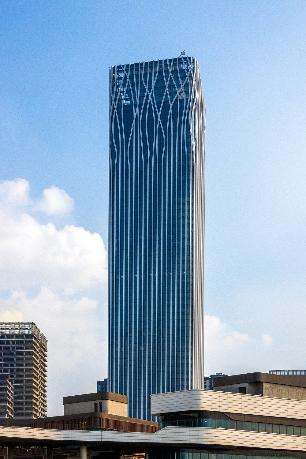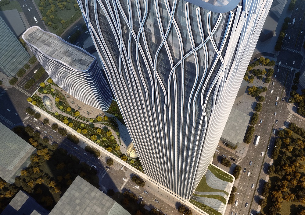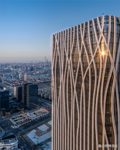 設計大師“樹”的設計理念突出體現在外立面幕墻。鋁幕線條從6層開始齊頭并進直至215米處,之后線條開始不規則地“開枝散葉”,使得前灘中心看起來更為靈動、生機勃勃。