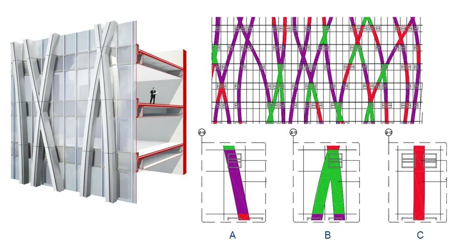 為追求水流的無序美感,塔樓頂端的鋁幕墻裝飾條均為不規則并伴有交叉的曲線。裝飾條轉角部位的鋁幕墻為工藝復雜雙曲面,項目中最大的一塊單元體線條,零部件數量超過100個單體,總面積達到19㎡,精度誤差要求不超過3mm,且安裝高度超過200米,制作和施工難度可想而知。