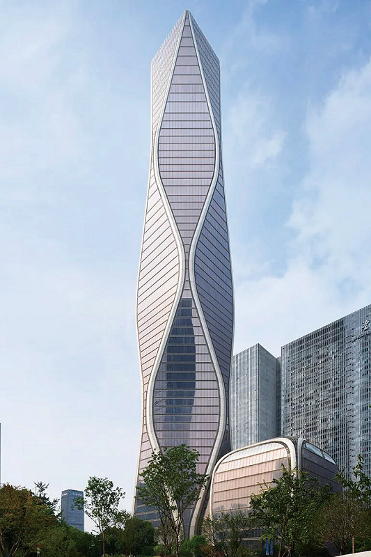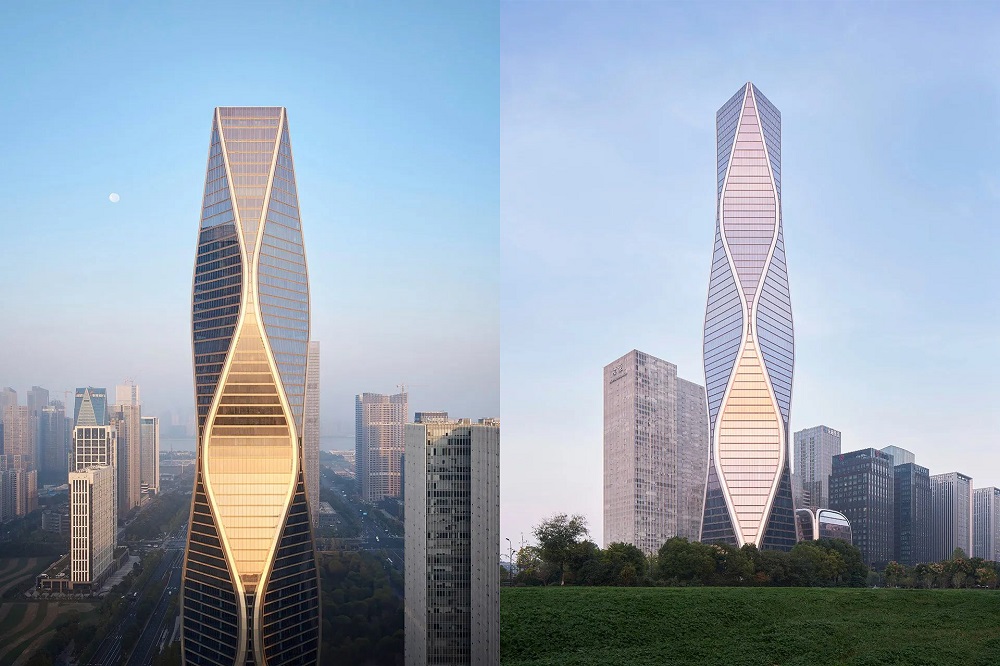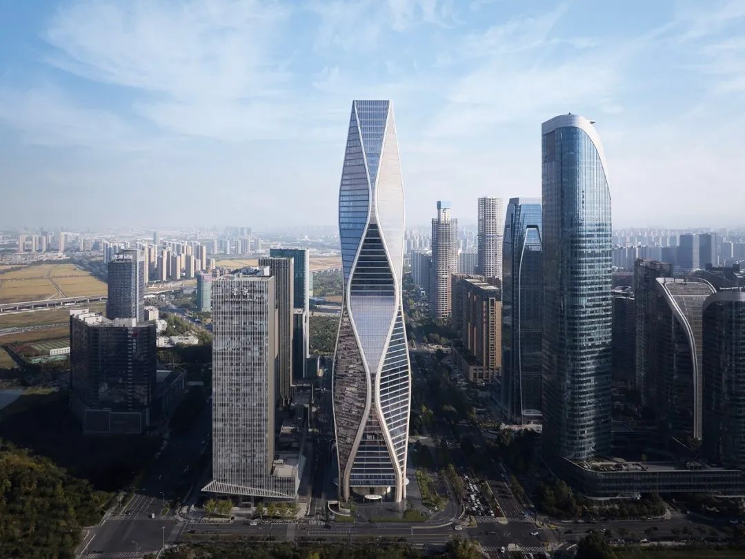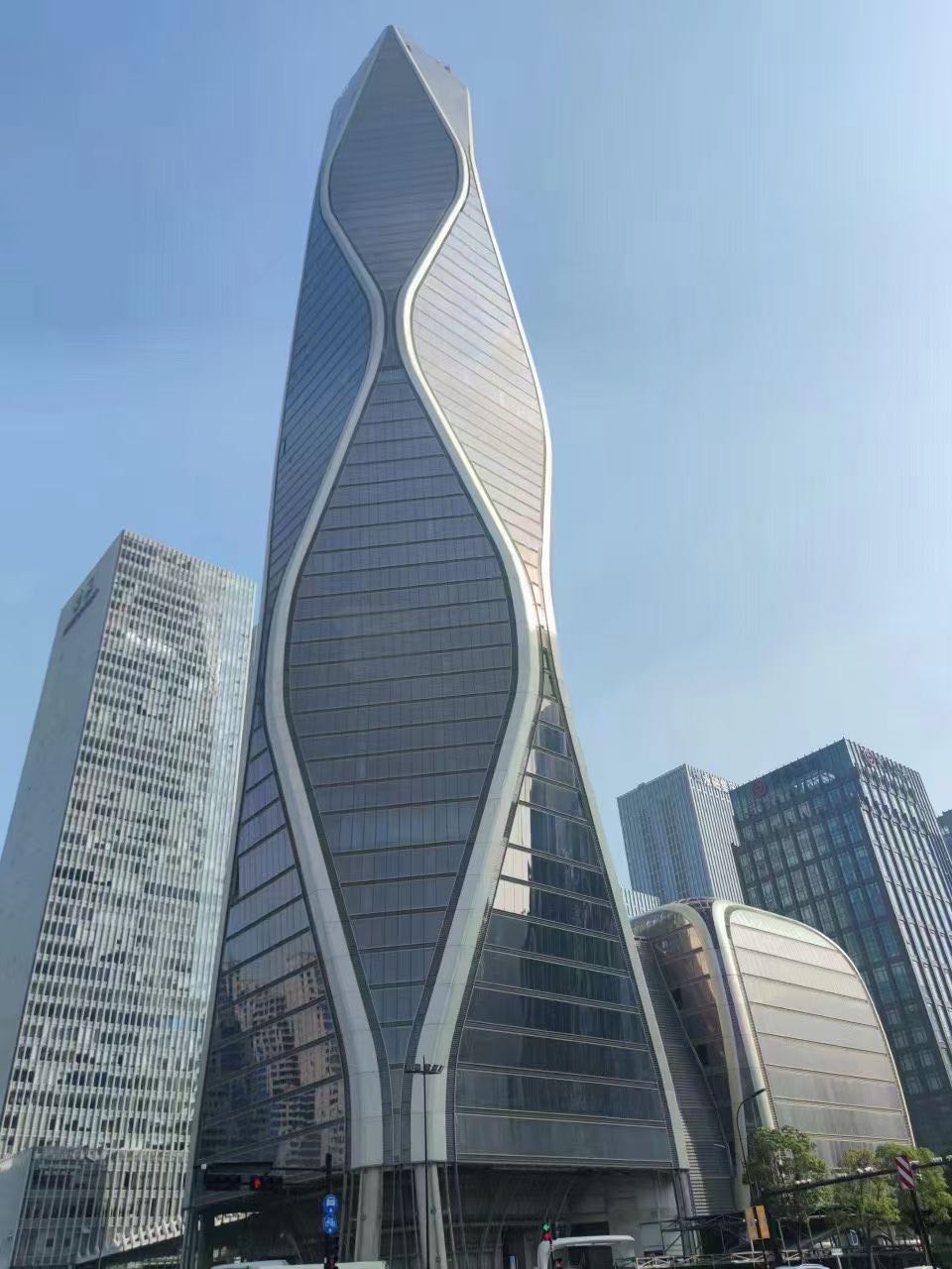 12.5 萬平方米的塔樓,造型獨特,沿著脈動的曲線向著云端升騰,讓人聯想到錢塘江漣漪的波紋。