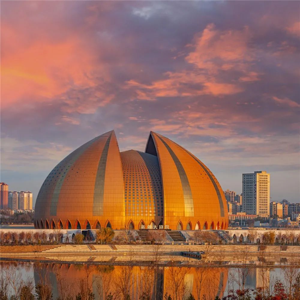 座落于昌吉的新疆大劇院,是中國目前最具民族文化特征的標志性建筑,也是印象西域國際文化旅游產業園的核心建筑。主體坐落在平緩的臺基上,以盛開的天山雪蓮為原型,通過抽象與創新的設計手法,形成里外套層的穹頂造型主體形象。