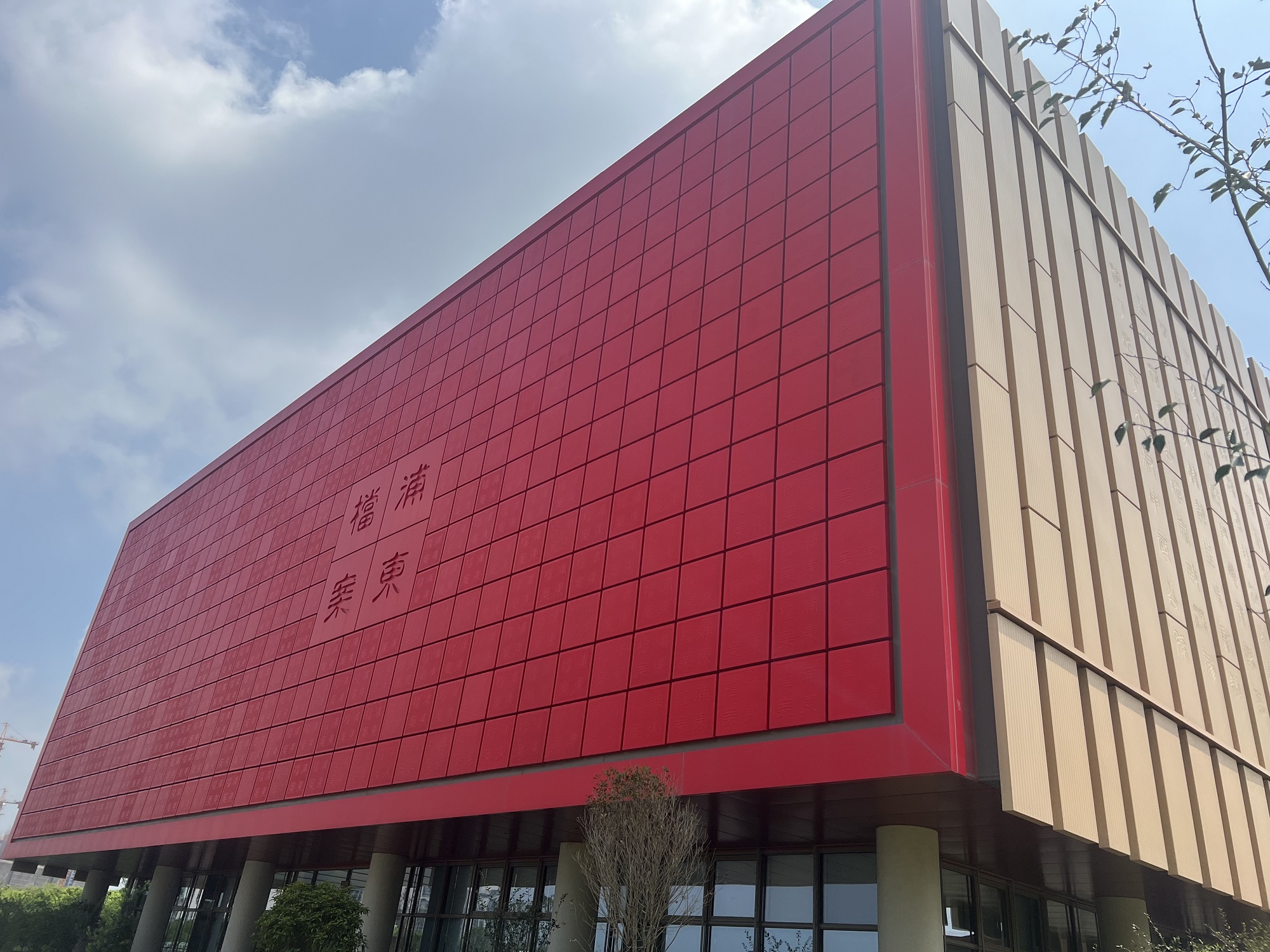 經(jīng)過一遍遍的編程、雕刻、噴涂嘗試,終于在5毫米鋁板上,用滿樘的浮雕工藝,生動(dòng)展示中國古代印章特征,塑造出風(fēng)化的蝕刻痕跡,將建筑外幕墻紅色印章和原色竹簡生動(dòng)還原, 更好體現(xiàn)檔案館外觀上的年代感和內(nèi)含海派文化特有的底蘊(yùn)。