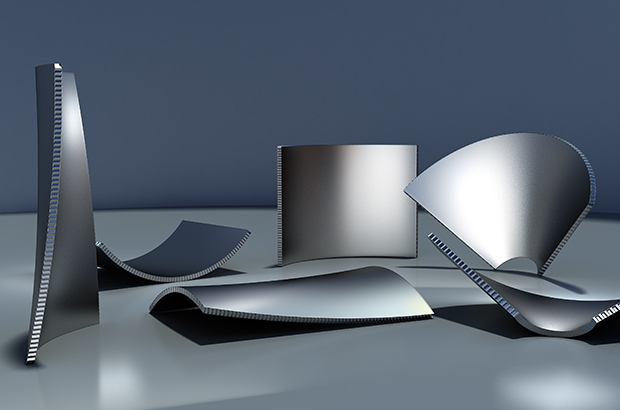 雅泰通過各種技術攻關,解決雙曲鋁蜂窩板雙扭曲問題,形成了一整套的無折痕鋁蜂窩板的加工成型技術,實現雙曲鋁蜂窩板的工業化生產。
